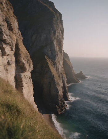 the photo showcases stunning cliffs along the shore, with the vast ocean just beyond. inspired by the style of beeple, it features an earth tone color palette and photorealistic details. the image exudes an austere simplicity, incorporating historical imagery. the light orange and dark cyan hues enhance the calm and serene beauty of the scene. ai generated