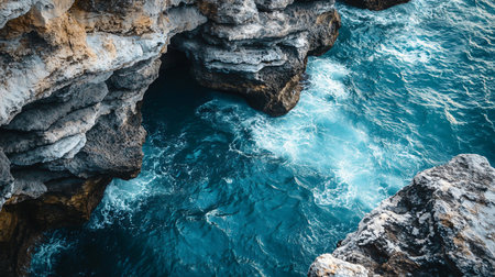 Aerial View of the Ocean From Above, Spectacular overhead view of a turquoise sea meeting rocky cliffs, AI Generated