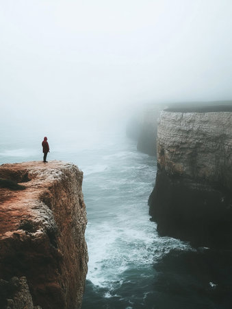 Lone hiker standing on a cliff looking at powerful ocean waves crashing against cliffs in foggy weather