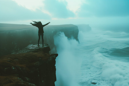 Woman standing on the edge of a cliff and looking at the ocean