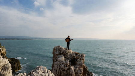 Hiker standing on cliff enjoying breathtaking ocean view, inspiring travel and adventure concept