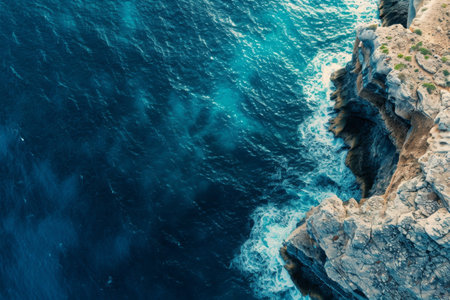A stunning aerial view of a cliff by the ocean, where the fluid water meets the natural landscape, creating a picturesque and tranquil scene under the open sky AIG50