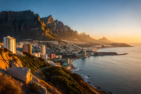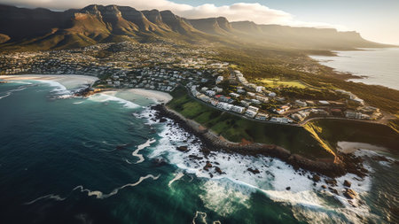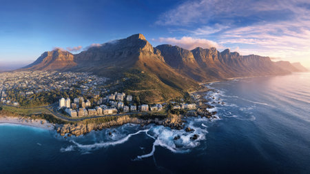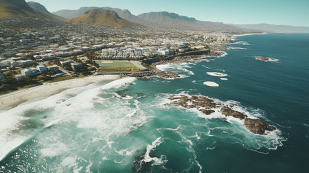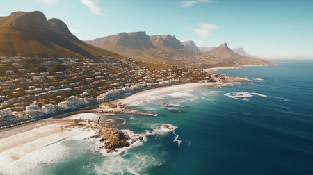 Aerial view of Cape Town, South Africa, showcasing the stunning coastline, residential buildings, and the iconic Table Mountain range with clear skies and ocean waves.