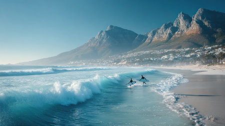 Two surfers are captured enjoying the ocean waves near a mountainous backdrop. The scene features brilliant blue hues reflecting off the water, creating a vibrant visual. This image could be used for promoting outdoor activities, travel, or any project that needs a natural and serene aesthetic.