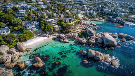 An aerial perspective showcases a coastal scene featuring vibrant turquoise water meeting a sandy shore. Large rock formations dot the seascape. Residential buildings with white exteriors are visible amidst lush greenery. The image is brightly lit, likely taken during the day. It has potential uses in travel, environmental, or lifestyle themes.