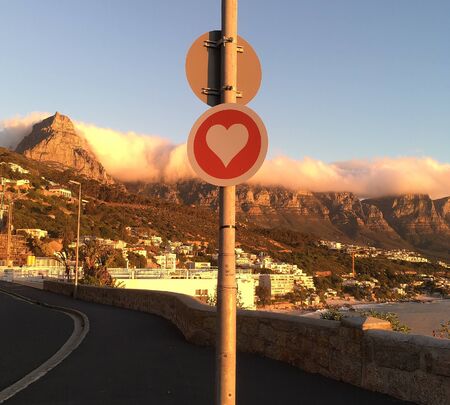 Road to love heart concept icon traffic sign on the road to Clifton Bay, Cape Town, nature landscape, vintage filter effect.