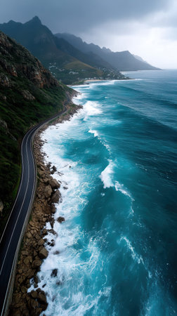 A Coastal highway with waves crashing against rocky shore under cloudy sky