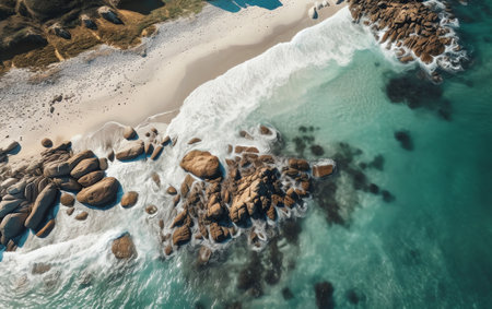 An aerial view captures the dynamic dance of waves crashing against rugged rocks, creating a stunning contrast of textures and colors. The vibrant turquoise water foams and swirls around the earthy tones of the stones, evoking a sense of tranquility and raw natural beauty.
