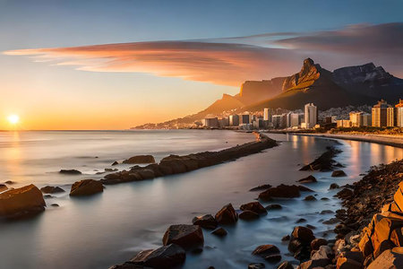 Coastline, beach and stones on the Atlantic coast. The concept of active, exotic and photo tourism. Fabulous port city Cape Town at the foot of Table Mountain