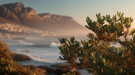 Fynbos bush, table mountain, and the twelve apostles with the atlantic ocean at sunset