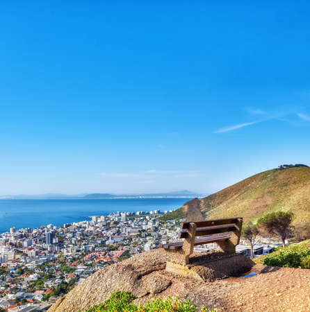 Beautiful aerial view of empty bench overlooking city and ocean in Cape Town, South Africa against blue sky copyspace. A calm sunny day with a park chair on a cliff, with scenic views and fresh air