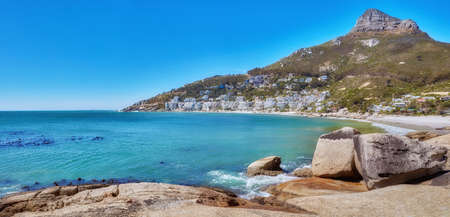A mountain near a calm beach in South Africa. Scenic nature landscape of Lions Head near a peaceful sea on a sunny day with copy space in Cape Town. Exotic location for summer vacation and travel