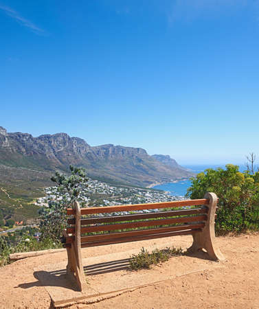 Bench near a cliff on the mountains with stunning views of the city sea on a blue sky copy space. Landscape of an empty outdoor relaxing seat area with nature scenery in Cape Town, South Africa