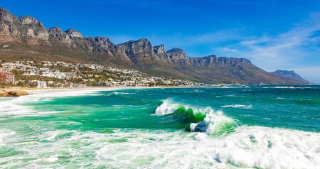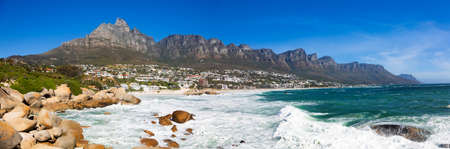 Panoramic side view of Camps Bay Beach and Table Mountain in Cape Town South Africa