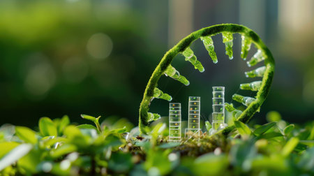 A visually striking representation blending a DNA strand with test tubes amid lush greenery, symbolizing the harmony between science and nature.
