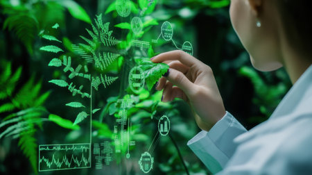 A scientist examines a green leaf in a vibrant natural setting, utilizing advanced technology to analyze plant data and visualize biological insights in real-time.