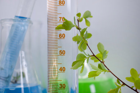 Natural drug research, Plant extraction in scientific laboratory glassware for cosmetic, Alternative green herb medicine, Minimal organic skincare beauty care.