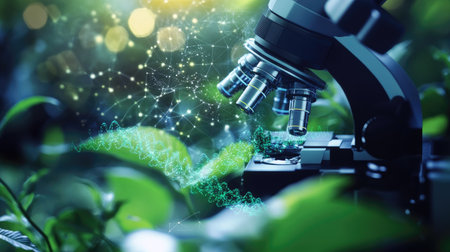 A scientist analyzing plant cells under a microscope and a magnifying glass