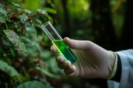 A scientist in gloves holds a test tube filled with bright green liquid amidst a rich, natural landscape. The vibrant greenery enhances the focus on the scientific work being done outdoors.