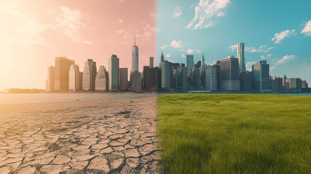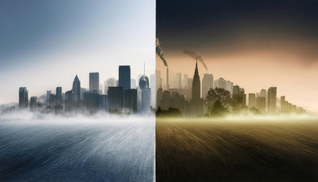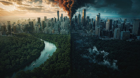 The image depicts a stark contrast between a polluted urban skyline and a desolate landscape, illustrating the severe impacts of climate change and human actions.