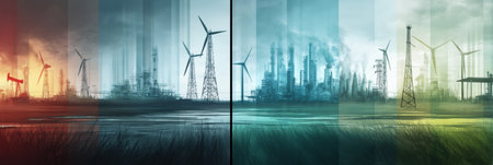 A split-screen reveals a harmonious blend of renewable wind energy and traditional petroleum industry, illustrating a vision of sustainable coexistence.