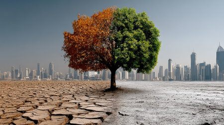 Symbolic tree showing environmental contrast--one side flourishing, the other withered--set against a city backdrop.