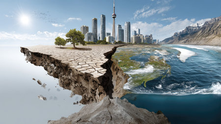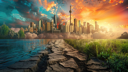 A stunning surreal landscape featuring a cracked earth transition into water, showcasing a vibrant urban cityscape and serene natural elements, illustrating environmental themes.