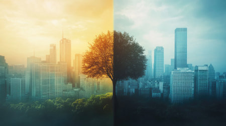 Split-screen cityscape with contrasting warm and cool tones divided by tree