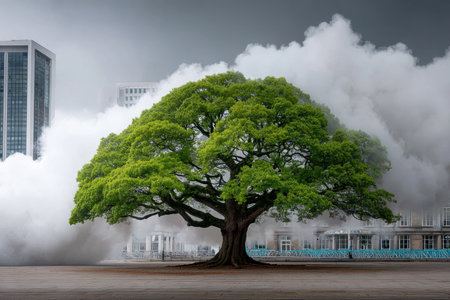 A lush green tree stands tall amidst swirling mist in a cityscape, creating a serene atmosphere.