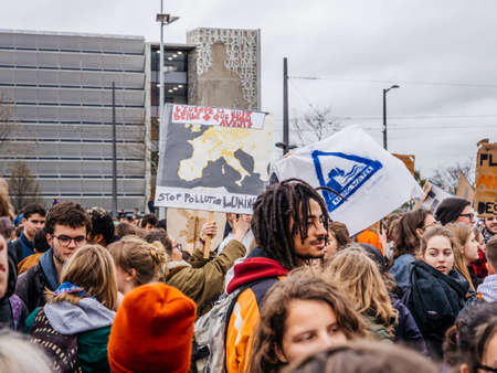 STRASBOURG, FRANCE - MAR 15, 2019: Protesters with placards on closed street at demonstrations against climate change global movement Fridays for Future started by Swedish schoolgirl Greta Thunberg