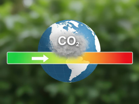 An image depicting the Earth surrounded by a CO2 cloud with a color-coded indicator showing carbon emissions levels.