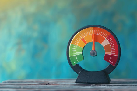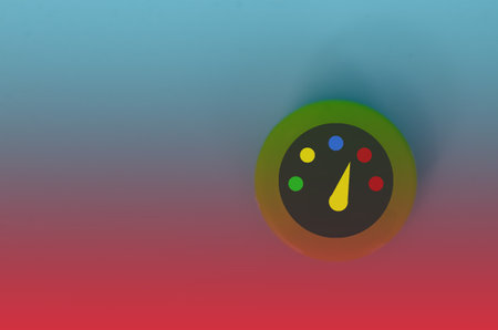 Closeup of a circular multicolored gauge with a needle, set on a vibrant bluegreen backdrop