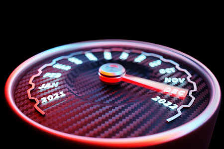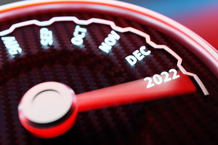 3D illustration close up black speedometer with cutoffs 2022. The concept of the new year and Christmas in the automotive field. Counting months, time until the new year