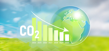 Reduction low CO2 emissions to limit global warming, climate change, safety ecology. Reduce levels of CO2 hand turn knob. New technology to decarbonize industry, energy, transport. Vector illustration