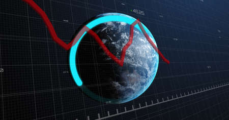 Image of red line recording and data processing over globe. global networks, data processing, connections and digital interface concept digitally generated image.