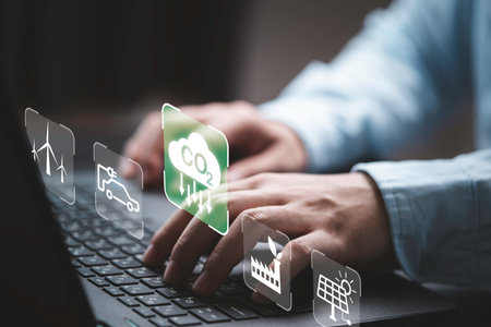 Organizations or companies develop carbon credit business virtual screen. Reduce CO2 emissions. Sustainable business development concept.