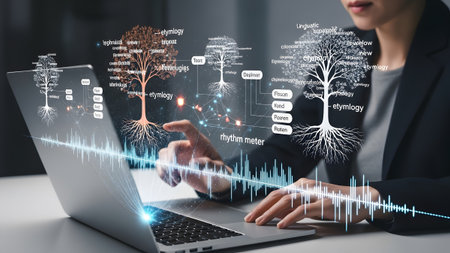 Hands interact with holographic etymology trees and rhythm meter waveforms displayed on a laptop.
