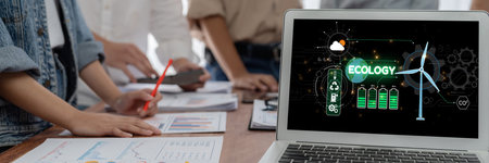 Women use computer for working Net zero technology and business carbon neutral concept. Reduce co2 emission, Carbon footprint, climate change to limit global warming, Renewable energy sustainability,
