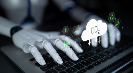 This image features a robotic hand showcasing carbon dioxide emissions in a futuristic setting, emphasizing the importance of sustainability and innovative technology for the environment. Auvana