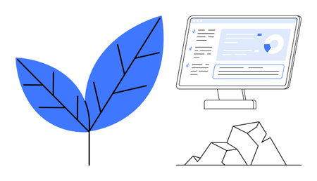 Sustainability, data visualization, eco-technology, environmental innovation, clean energy, business analysis. Blue leaf symbol, computer monitor with analytics abstract shapes. Sustainability