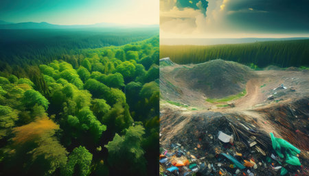 Vivid trees thrive on one side while waste fills the other, urging action for a cleaner planet.