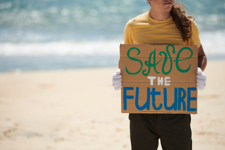 Cropped image on volunteer standing on sandy beach and holding save the future placard