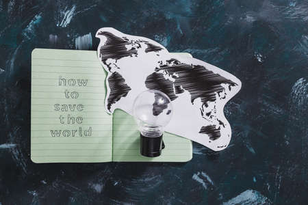 concept of environmental awareness, How to save the planet text on notepad with light bulb and world map