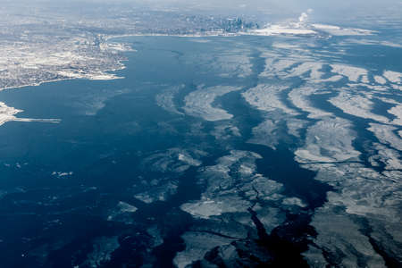 The frozen river's cracked ice patterns are mesmerizing from the air, photography emphasizes the cool blues and whites, banner