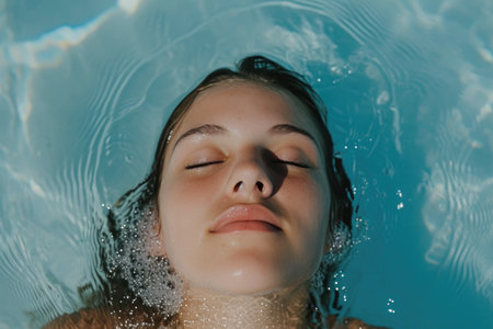 A woman floats peacefully, her face illuminated by the warm glow of the water.