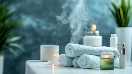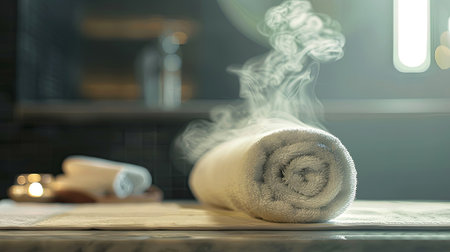 White towel is rolled and steaming on a wooden surface in a calming bathroom, with soft lighting and blurred elements enhancing the relaxing ambiance, AI generated