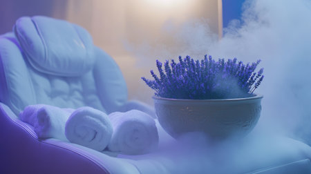 Experience a tranquil spa environment featuring aromatic lavender and soft towels, perfect for relaxation and rejuvenation in a serene space.