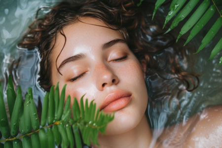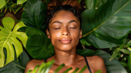 Beautiful woman relaxing among lush green leaves, enjoying tranquility of nature. serene atmosphere enhances her peaceful expression, creating perfect spa like experience