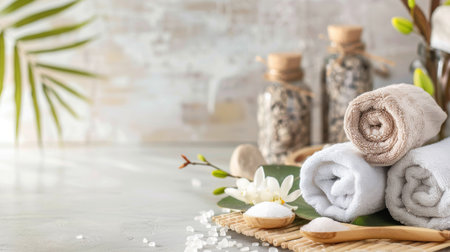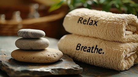 Relaxing spa setup with rolled towels, essential oils, and stones in a tranquil environment during a calm afternoon