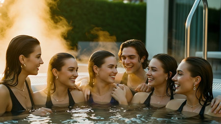Group of happy young people having fun in swimming pool at spa resort